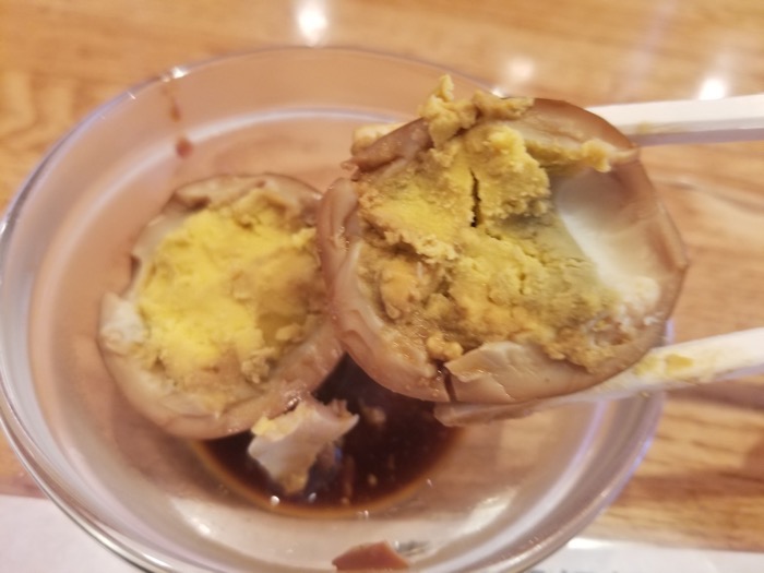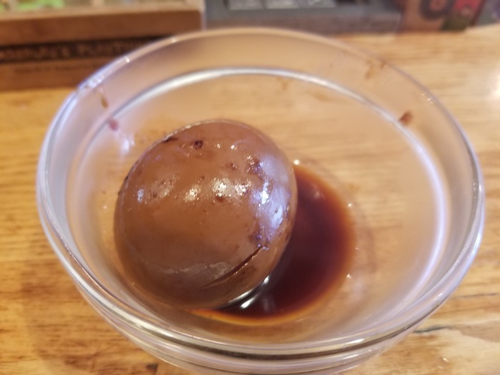 お通しの煮卵。この煮卵、なんと無料です。