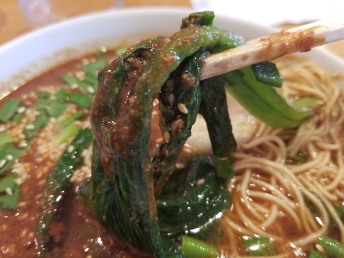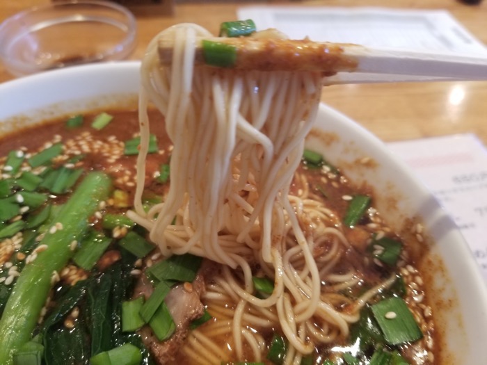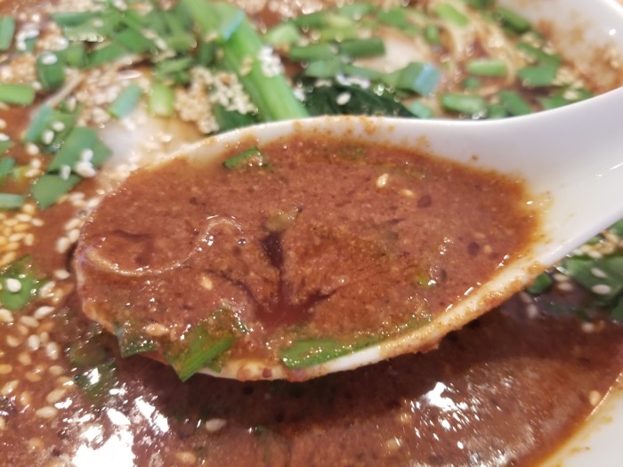 スープがドロッとしていて、ゴマのペーストがたっぷりと使われているのがわかります。油も多めで、最後まで冷めずに食べられます。