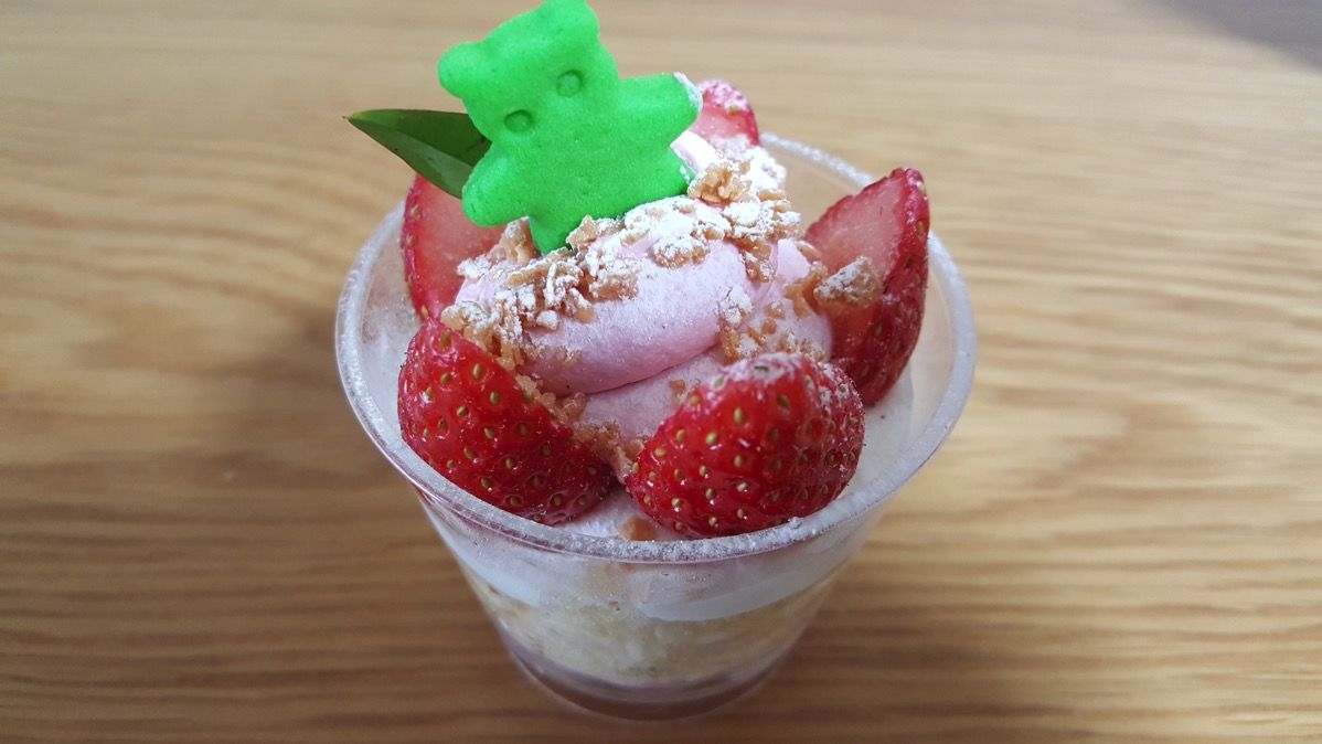 カップの中にスポンジケーキと生クリーム、いちごのクリームを入れて、いちごを乗せたもの。