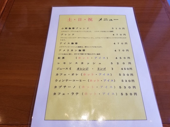 小野珈琲のメニューはどんな感じ?