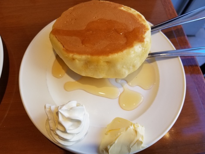 今風のパンケーキのふわふわした感じを期待していると、ちょっと残念に思うかもしれませんが、このホットケーキは昭和っぽくて、これはこれでありだと思います。