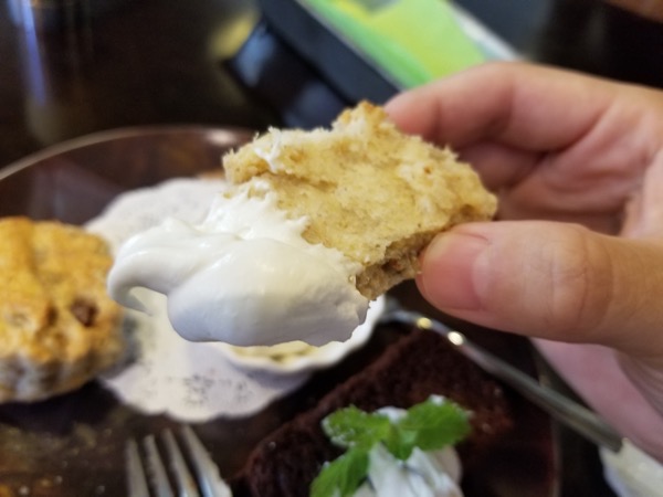 一般的にスコーンはパサパサしているので、口の中の水分が奪われるんですが、このスコーンはホイップをついているので、パサパサ感を全く感じることなく食べることができます。
