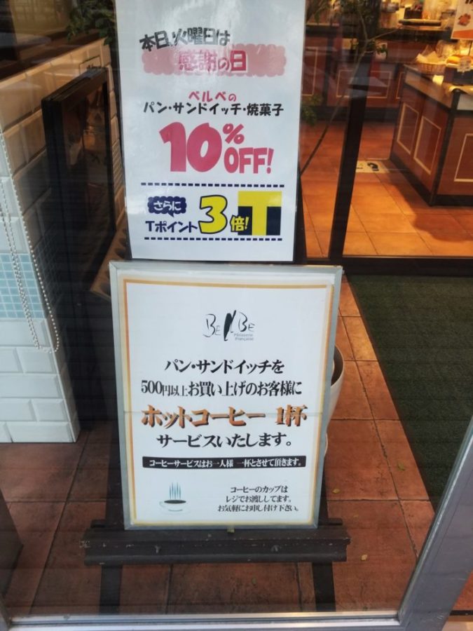 そのほか、パンやサンドイッチを500円以上購入すると、コーヒー一杯いただけるというサービスもやっています。