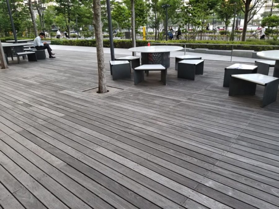 ベルベ豊洲店の外にある休憩スペース