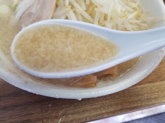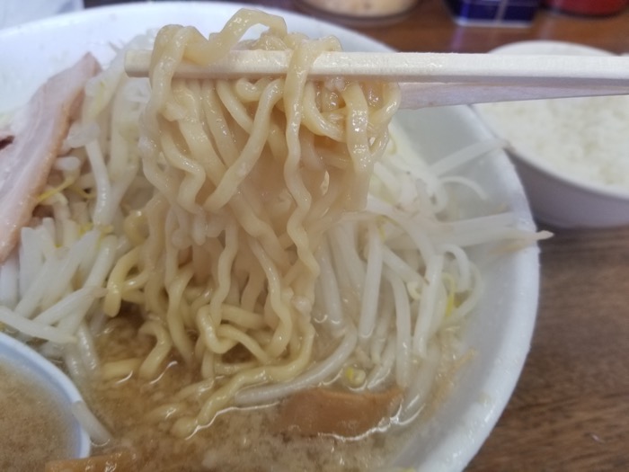 麺は中太麺で、背脂たっぷりのスープと相性ピッタリです。もちもちした食感で、シャキシャキもやしとの食感の違いが楽しいです。