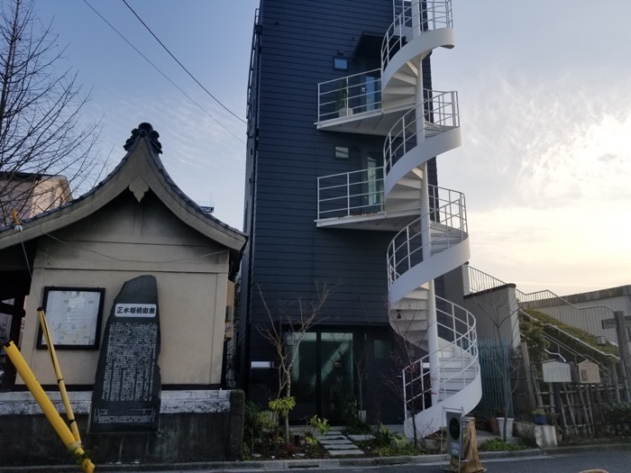 螺旋階段が目立つおしゃれな外観をした建物の一階部分にあります。