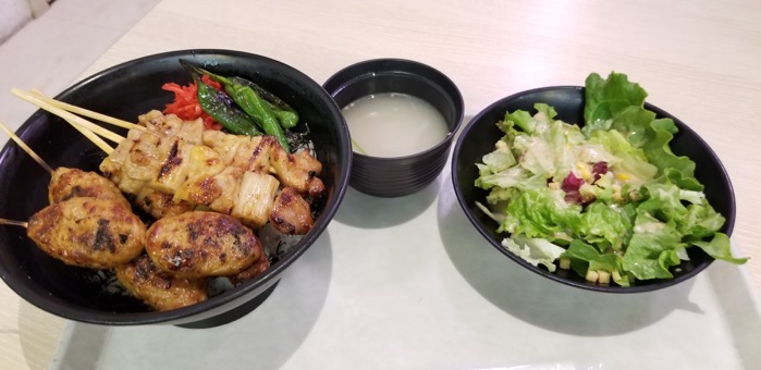 こちらが丼米の人気No1メニューのあぶりどりの焼き鳥丼です。焼き鳥のつくねが2本とネギまが3本乗っています。