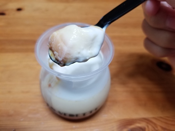 たっぷりのホイップがのっていて、贅沢感があります。プリン本体はとろっとしていて、口に入れるとなめらかさを感じることができる上質のプリン。