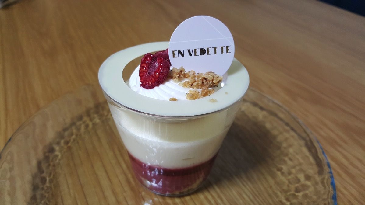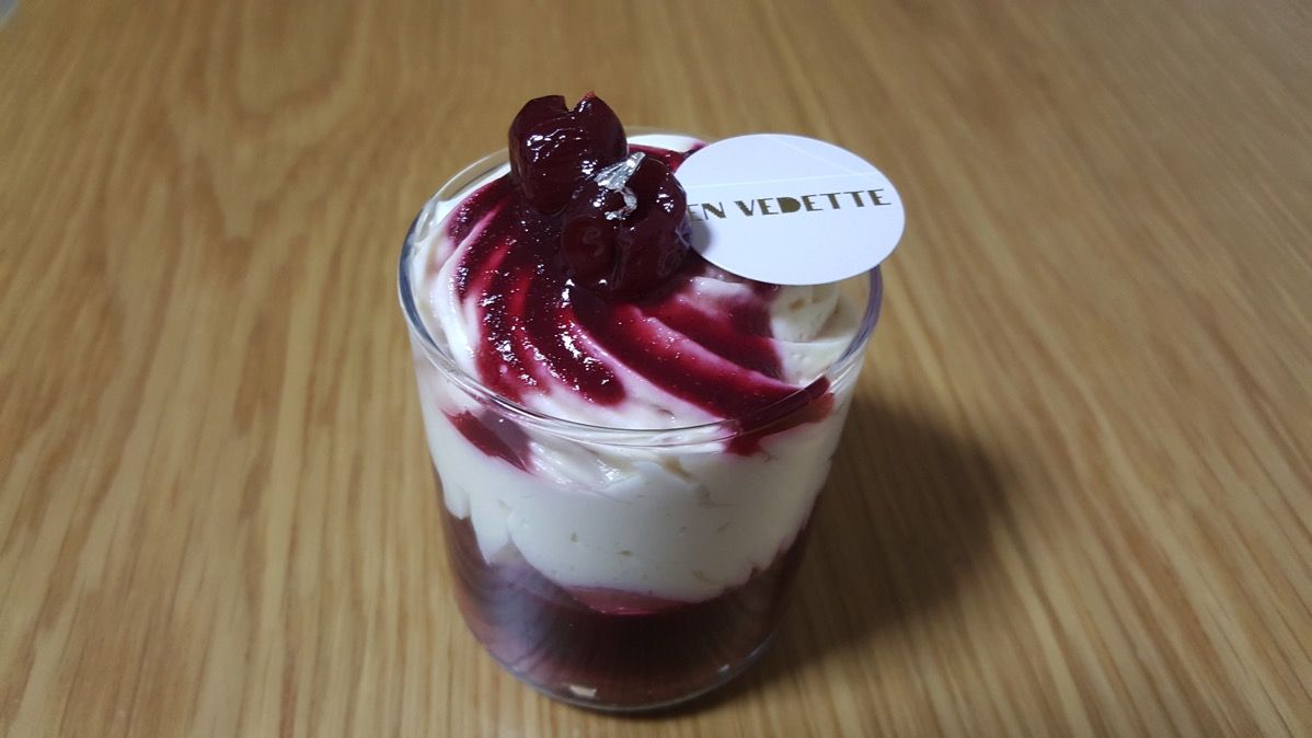サヴァランにホワイトチョコのムースとグリオットチェリーのソースを組み合わせたスイーツで、見た目もおしゃれだし、味も最高においしくて大満足な一品でした。