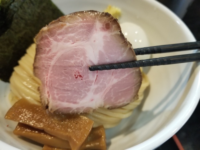 麺の上に乗っているチャーシューは、つけ汁の中のチャーシューとは少し違っていて、ほど良いピンク色していて、ロースハムのようです。