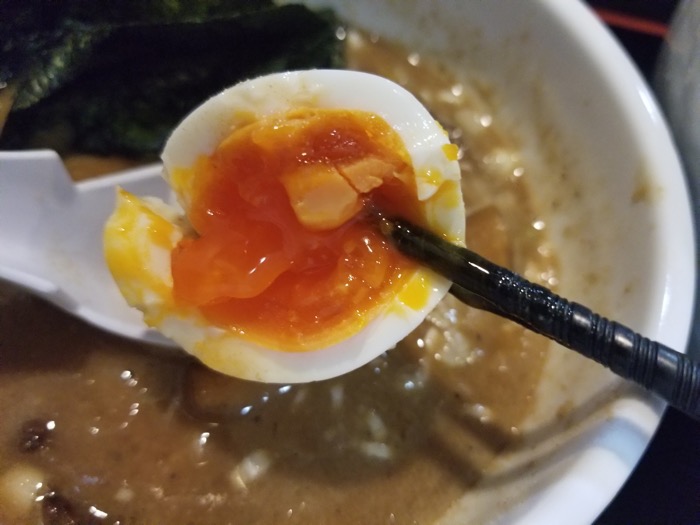 卵は絶妙なゆで加減で、ほどよい半熟になっています。黄身がとろっとしていて、これだけでごはん一杯いけます(笑