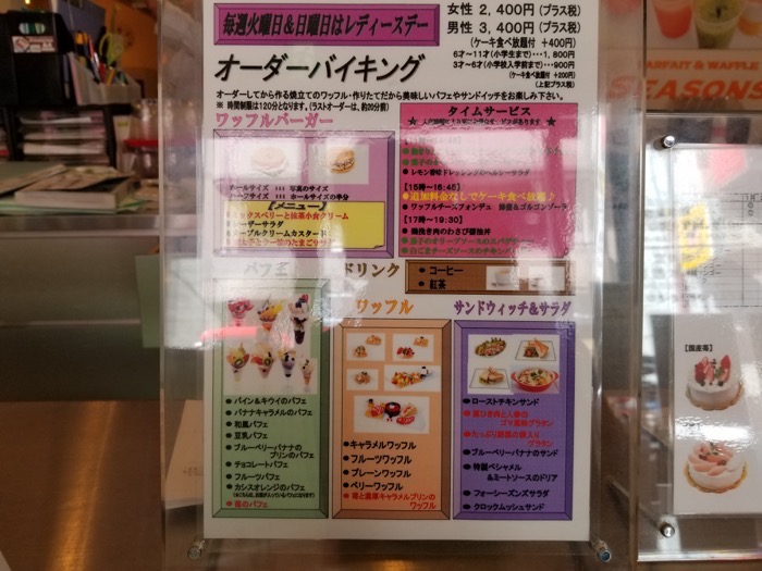 オーダーバイキングは女性2400円、男性3400円で、+400円でケーキの食べ放題を付けることもできます。ただし、バイキングの対象のケーキは500円未満のケーキのみです。