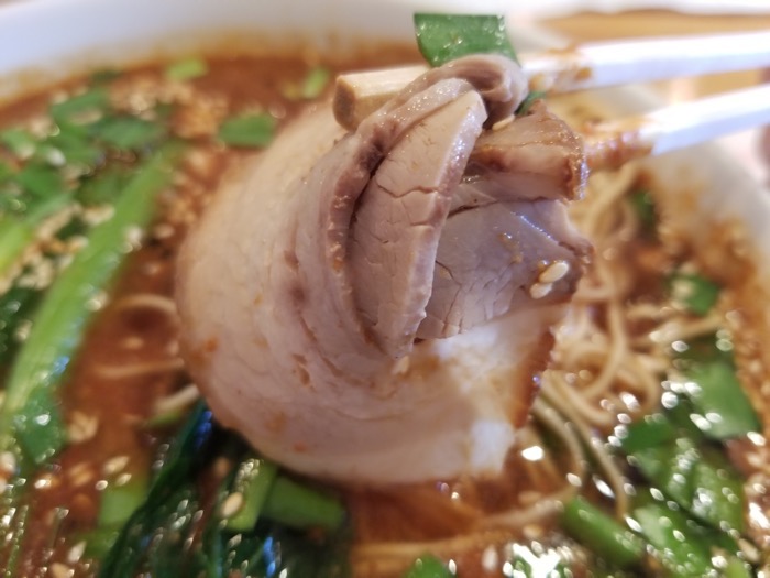 チャーシューはほろほろして、柔らかいです。厚みのあるチャーシュが食べたいなら、太肉坦々麺を注文すると良いです。