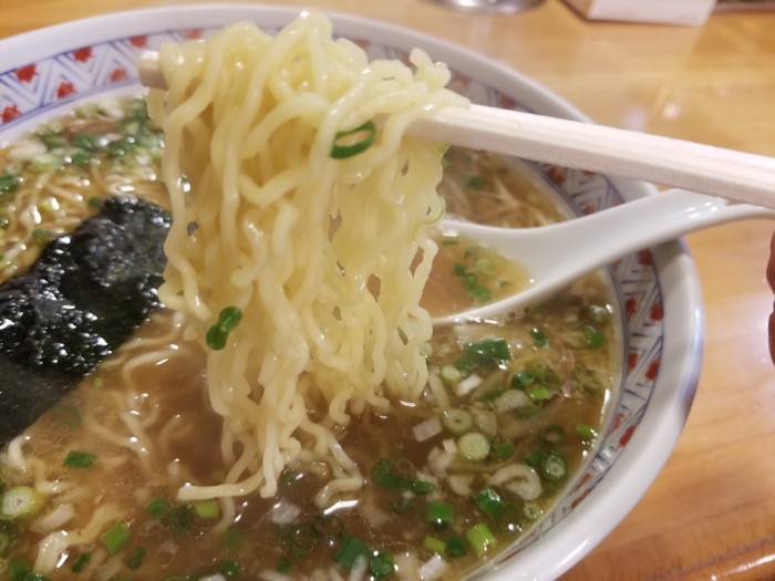 麺は細めのちぢれ麺。ツルツル食感が心地よいです。スープはあっさりしていますがが、麺にスープがしっかり絡んでいます。