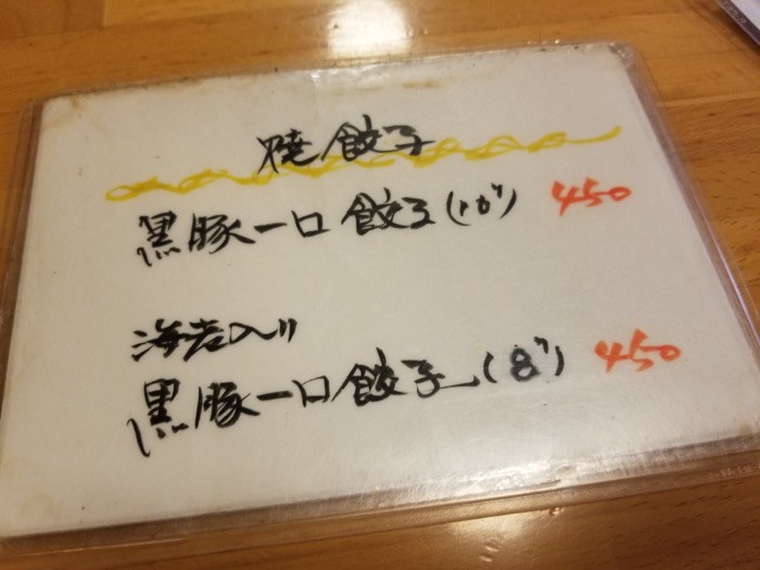 麺類の他に焼餃子があって、黒豚一口餃子と海老入り黒豚一口餃子から選べます。