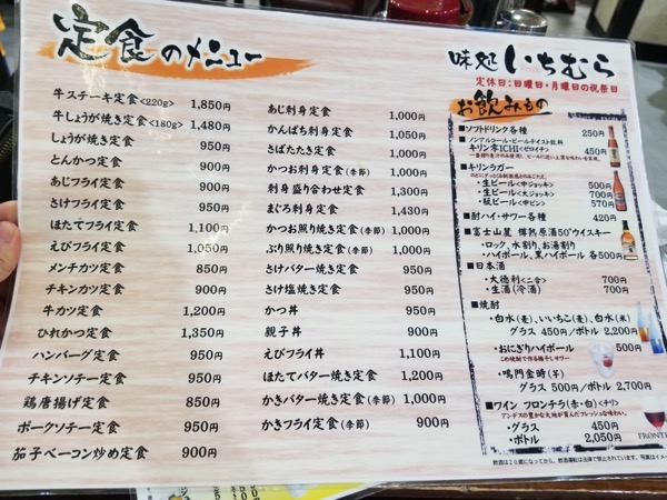 肉のイチムラの系列店だけあって、肉メインの定食が多いですが、刺身定食もあり、定食メニューはかなりの充実っぷり!