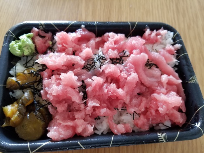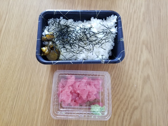 マグロの中おち丼はごはんとマグロが別容器に入れられていて、ごはんは温かく、マグロは冷たい状態です。一緒にすると、ごはんの温もりでマグロが傷んでしまうことを考慮して別容器で提供しているんでしょうね。