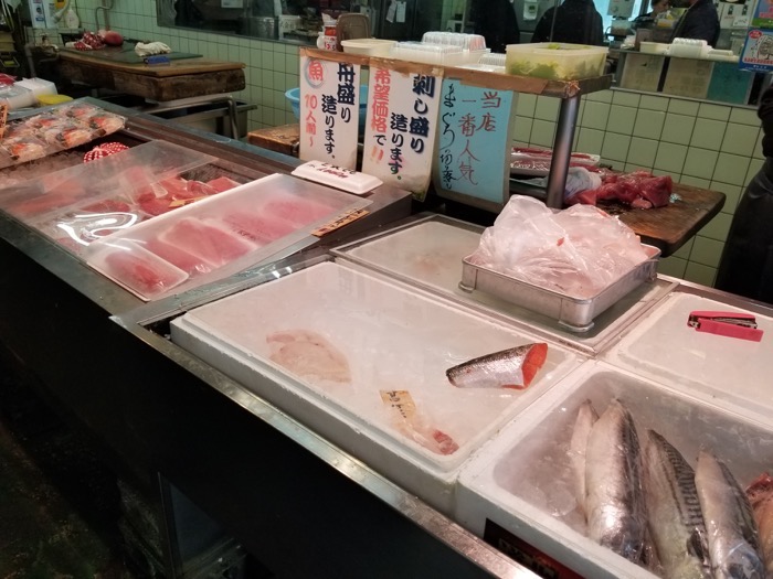 店内に入ると、鮮魚が並んでいて、その奥では魚が捌かれてました。刺し盛り・舟盛りを造っていただくこともできるようです。