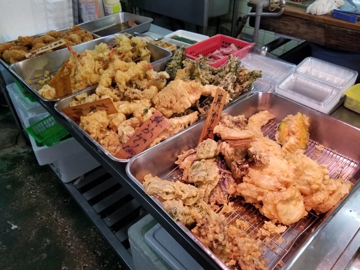 天ぷらは単品での購入もできて、カキ、真いかゲソ、海老などあって、価格は100円!