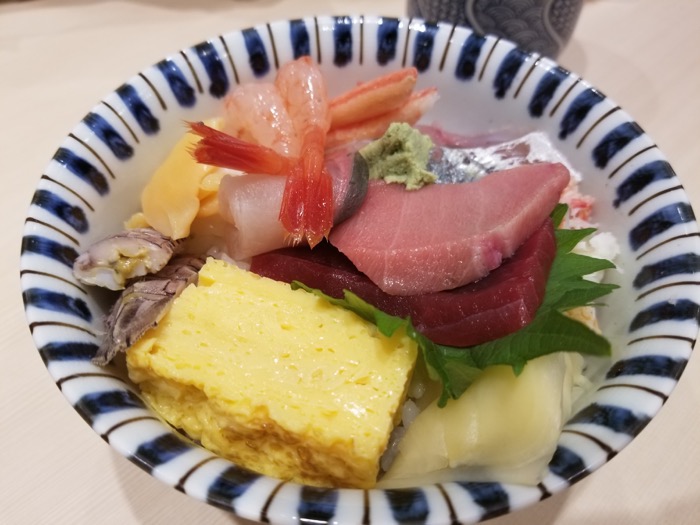 10分かからないくらいで着丼。まぐろの赤身、トロ、甘エビ、ズワイガニ、アジ!シャコガイ、ハマチ、卵焼きがのってます。