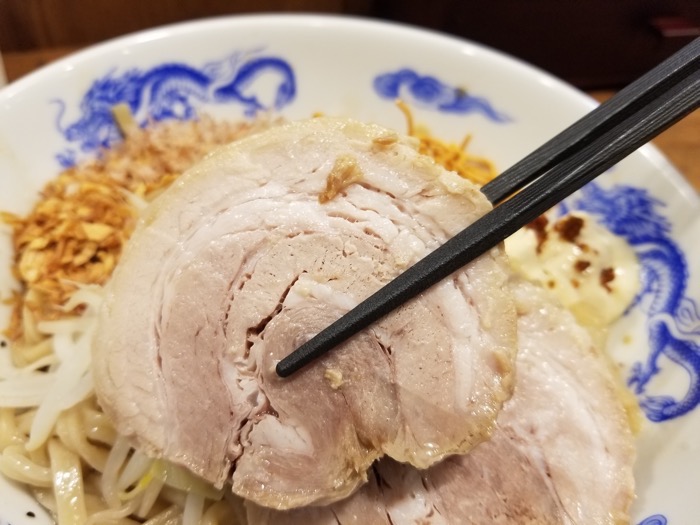 チャーシューがなかなかのボリューム!写真からは分かりにくいですが、1cm弱の厚みがあり、存在感があります。厚みはあるものの柔らかくて、箸で簡単に切れます。