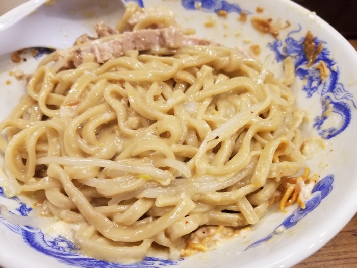 全体を混ぜるとこんな感じ。麺の下に濃いめの旨味があるタレがあって、麺の上にはマヨネーズと卵があるので、混ぜると麺がカルボナーラのような見た目になってます。