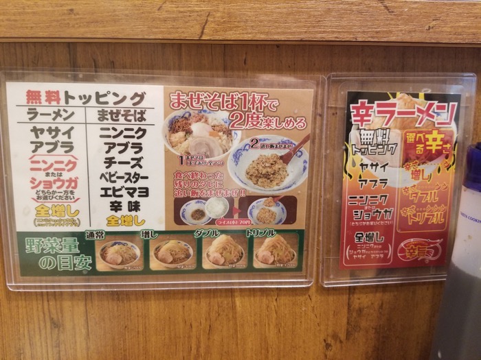 アブラ、ニンニクなど、ラーメン二郎のコールと同じようなものがあって、無料で野菜などを増やすことができます。