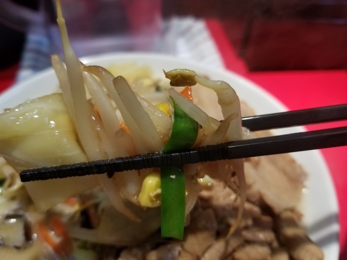野菜はにんじん、とうもろこし、もやし、キャベツ、ニラ、玉ねぎ、きくらげの7種類。たっぷり350グラム入っています。注文時にトッピングでしょうかかニンニクを入れることができます。