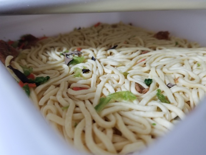お湯を入れて5分たったら、湯切りして、ソースを絡めて出来上がり。