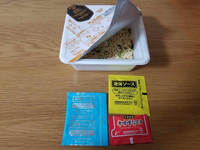 ふたを開けてみると、中には、粉末ソース、液体ソース、辛味噌風味マヨの3つが入ってます。