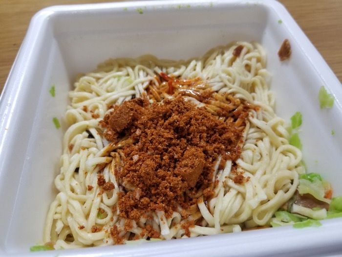 蒙古タンメン中本「辛旨焼そば」には粉末ソースと液体ソースの2種類あるので、両方をかけてから混ぜます。