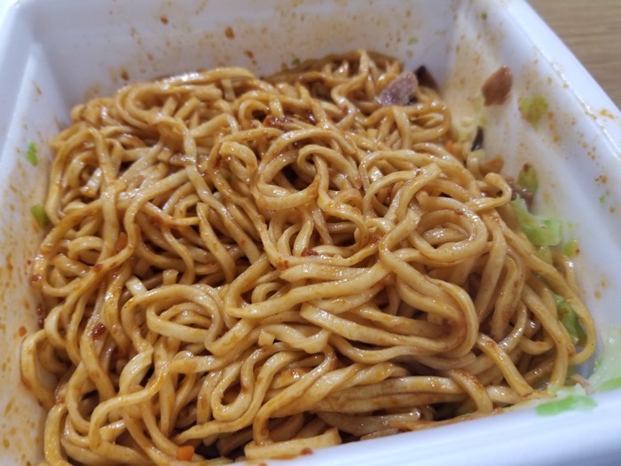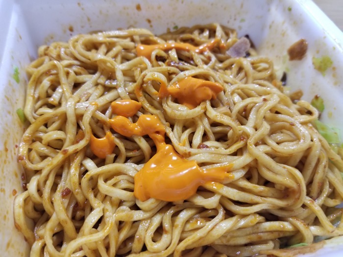 焼そばのソースのB級グルメ感とかジャンク感がたまらない上に、ちょっと辛くて食欲が刺激されて、一口食べると箸が止まらなくなる旨さ!