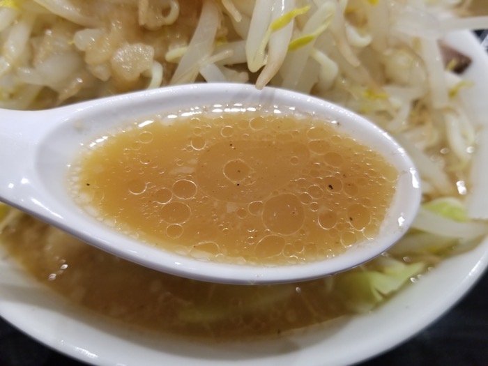 麺は二郎系らしく、太めの平打ち麺です。二郎のごわごわ感とかザラザラ感はあまりなく、表面がつるつるしていて、二郎とは違った食感を楽しむことができます。