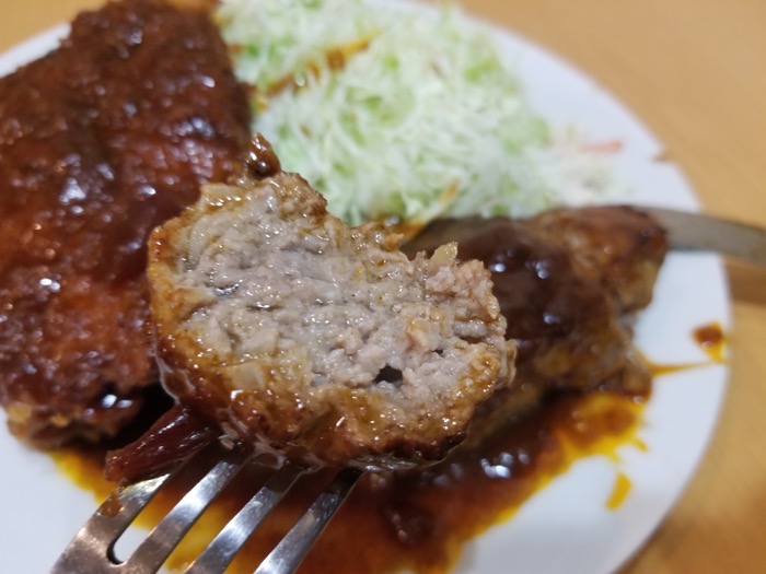 口に入れると肉汁がジュワーっと口の中に広がります。デミソースとの相性が抜群。