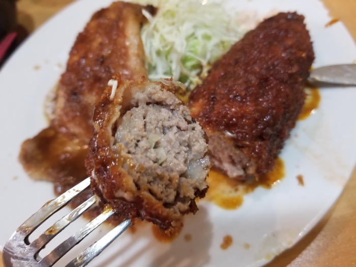 豚ロースでチーズを巻いて、、ころもを付けて揚げているんだと思いますが、チーズの量が想像以上で、チーズ好きならこれはかなりテンション上がりますよ。