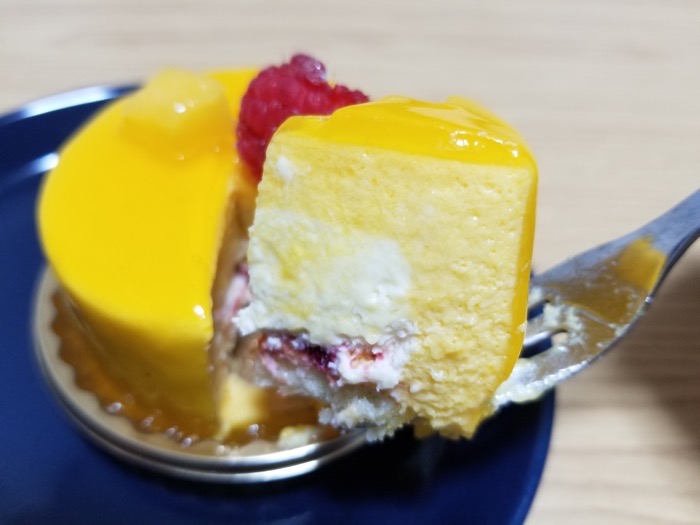 マンゴーとクリームチーズのムース。中にラズベリーのソースが入っていて、甘酸っぱくて爽やかです。
