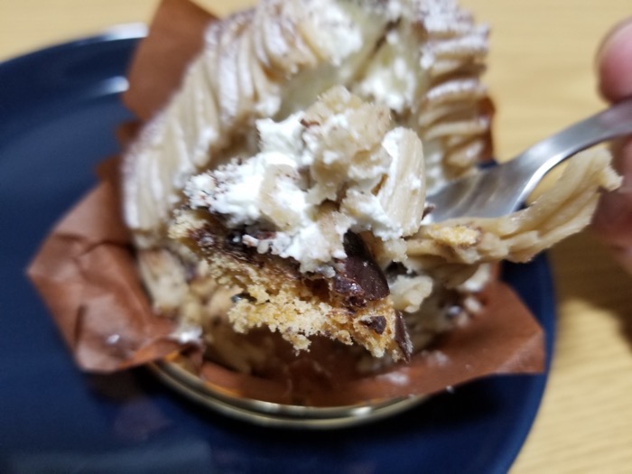 中にはホイップと、栗の渋皮煮が入っています。底の部分は焼きメレンゲでサックサクの食感が良いアクセントになっています。