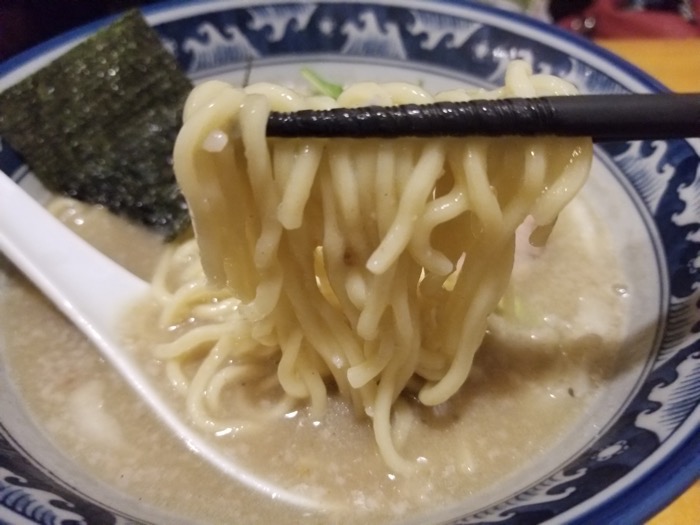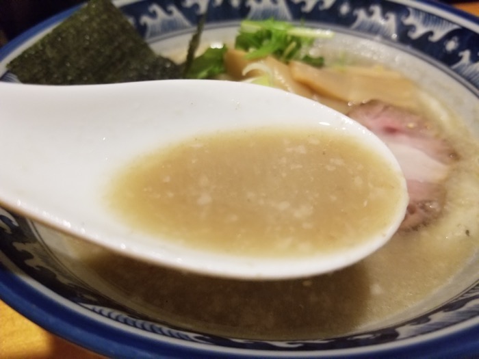 スープは濃厚ですが、しっかりと塩味がしていて、塩ラーメンであることを認識させられます。鶏ガラ、豚骨、昆布、野菜で取ったスープで深みがあってうまい!