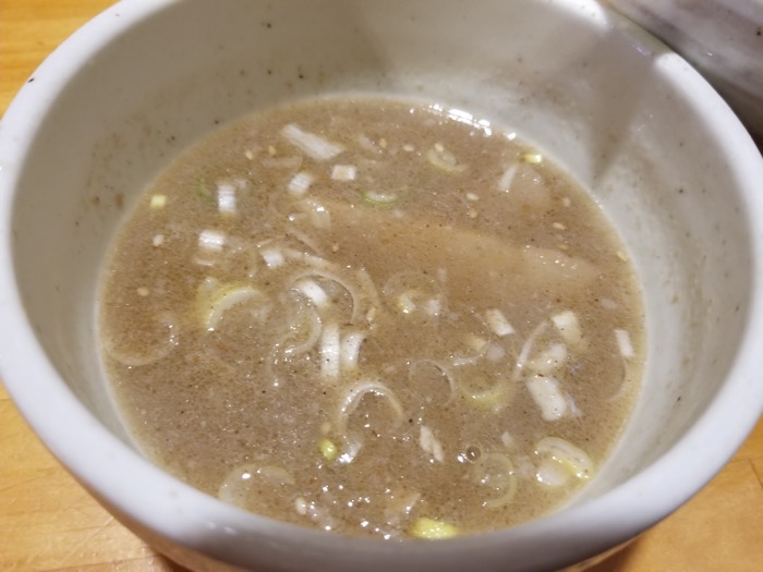 つけ汁はメンマや刻みネギが入っています。味は塩味がしっかりしていて、見た目よりパンチのある味わい。