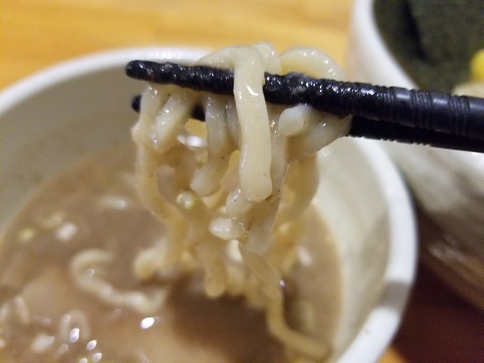 麺はつけ麺らしい太麺で、コシがあってモチモチ食感。つけ汁もしっかり絡みます。