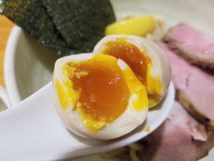 味玉は個人的にはかなり好きなゆで具合で、中心部分は黄身が固まらず液状になっています。この黄身を麺に絡めて食べるのもうまい!