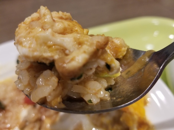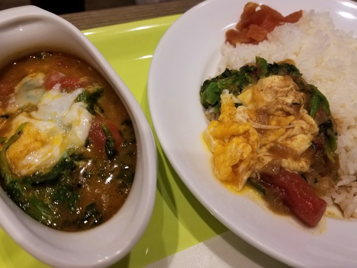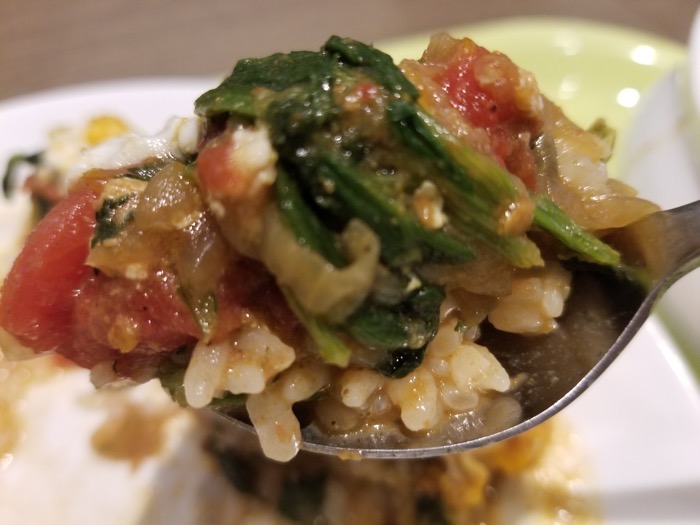 ポパイカレーはその名の通り、ほうれん草がたっぷりと入っていて、このほうれん草がカレーと相性抜群でうまい!そして、ほうれん草もトマトも大きめでゴロゴロした感じが個人的に気に入りました。