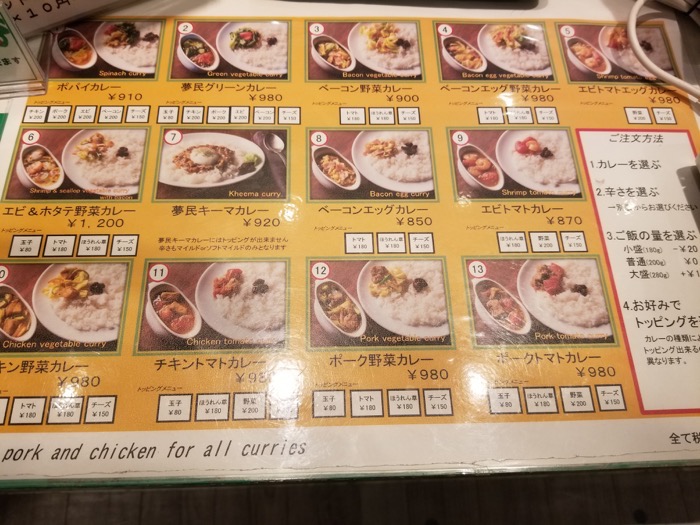 カレーは13種類あって、料金は1000円前後です。玉子(80円)やチーズ(150円)、ほうれん草(180円)などのトッピングをすることもできます。