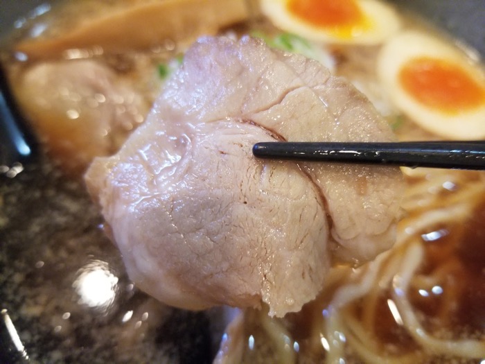 チャーシューはしっとりしていて、厚みはないものの、噛むとジューシーで豚の旨味をしっかり感じられるチャーシュー。