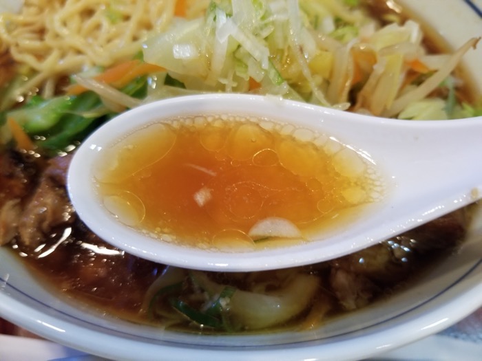 スープは豚の背脂が少し浮かんでいて、こってり系の醤油ラーメンかと思いきや、意外にあっさりしていて、野菜の甘みも感じる優しいスープ。