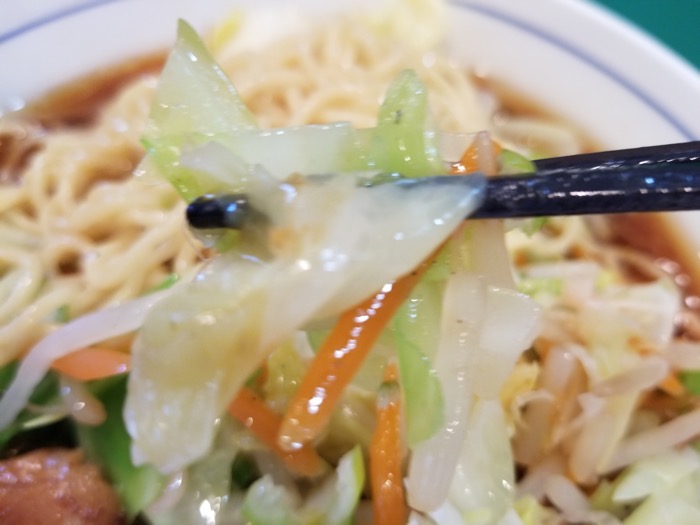 野菜はキャベツ、もやし、にんじんで、ゴマ油と野菜がよく合っていておいしい。野菜の量も思ったより多くて、ラーメンなのに健康的(笑)
