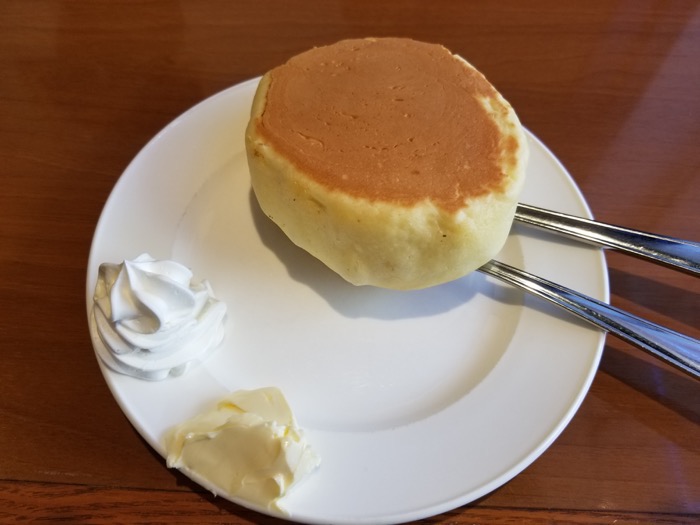 今風のパンケーキのふわふわした感じを期待していると、ちょっと残念に思うかもしれませんが、このホットケーキは昭和っぽくて、これはこれでありだと思います。