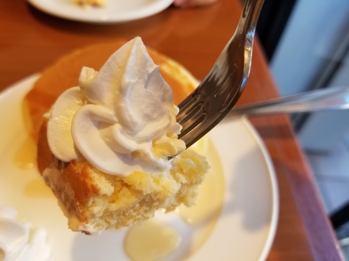 メープルシロップを染み込ませて、ホイップを乗せていただきます。ホイップは程よい甘さで甘すぎなくてちょうど良い感じです。