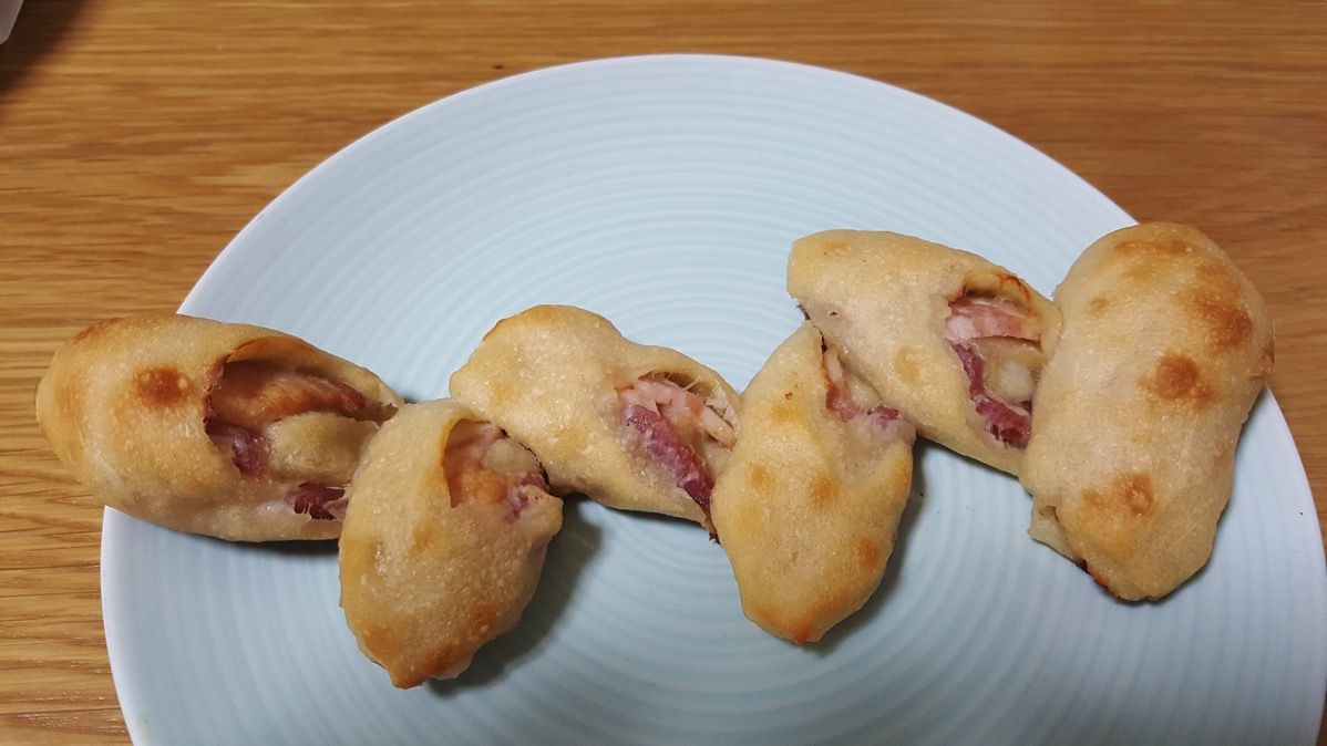 ベーコンの塩味が強めで、ベーコンだけだとしょっぱいかもしれませんが、生地と一緒に食べることで塩加減が絶妙になっていて計算されてると思いました!