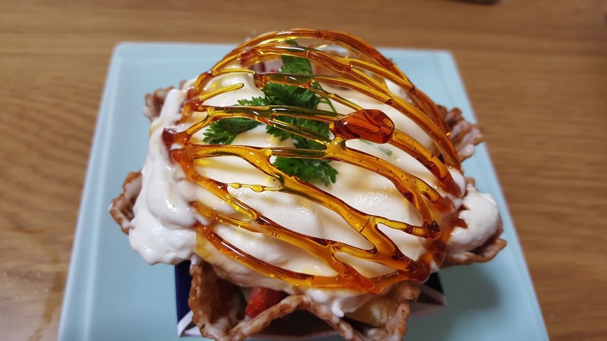ソフトクリームのコーンのような生地に、スポンジ、たっぷりのフルーツ、生クリーム、飴細工で構成されてます。フルーツグラタンというだけはあって、フルーツはたくさん入っていて、イチゴ、ブルーベリー、メロン、キウイなど入ってました!ボリュームがあるのに、値段は400円とリーズナブル!